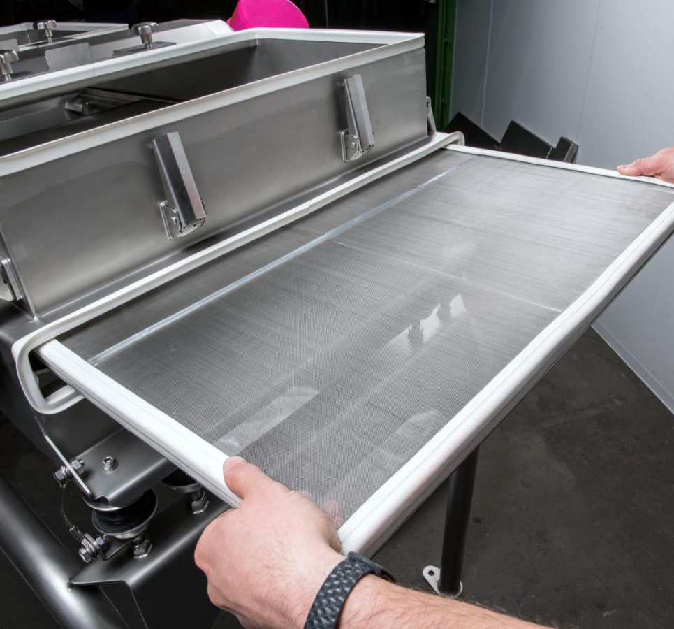Gerade was die Schnelligkeit des Siebwechsels angeht, bieten Rechtecksiebe Vorteile. Nachdem die Schnellspanner gelöst und der frontale Maschinendeckel entfernt sind, können die Siebeinleger einfach stirnseitig herausgezogen werden. Das Sieb muss dafür nicht von der Produktzu- und -abführung abgetrennt werden, sodass der ganze Vorgang nicht länger als 30 Sekunden dauert. Das spart nicht nur wertvolle Zeit beim Siebwechsel, auch die Inspektion der Siebeinleger erfolgt mit wenigen Handgriffen. Rundsiebe müssen in der Regel erst von der Produktzuführung getrennt werden, damit der Maschinendeckel und die einzelnen Siebdecks demontiert und nach oben aus der Maschine entnommen werden können.