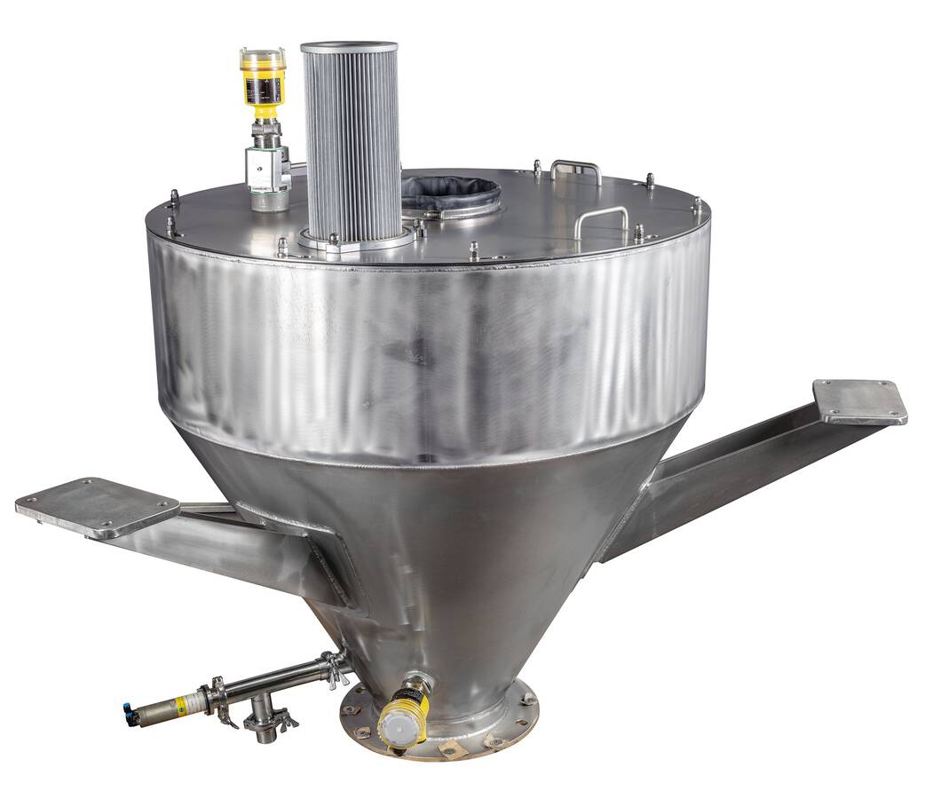 Der Vorlagebehälter ist mit zwei Füllstandsmeldern ausgestattet, die den Mindest- und Maximal-Füllstand überwachen. Auch hier war es dem Betreiber wichtig, das Equipment an verschiedene Produkte und Prozesseigenschaften anpassen zu können. Denn die verteilen sich auch auf unterschiedliche Art und Weise im Behälter. Trockene, rieselfähige Produkte bauen eine gleichmäßige Materialsäule im Behälter auf, die Füllstandsmessung ist unproblematisch. Produkte mit ungünstigeren Fließeigenschaften verteilen sich oft ungleichmäßiger und bilden steile Schüttkegel unter dem Einlauf, was die Messung erschwert. Bei dem Vollmelder entschied sich der Betreiber daher für eine Schwinggabel mit Rohrverlängerung, bei der die Gabel an jeder beliebigen Stelle des Rohrs befestigt werden kann. Zusätzlich ist der Vorlagebehälter mit einem Schneckenprobenehmer ausgestattet. Der ermöglicht es dem Betreiber, Proben aus dem laufenden Produktstrom zu entnehmen.