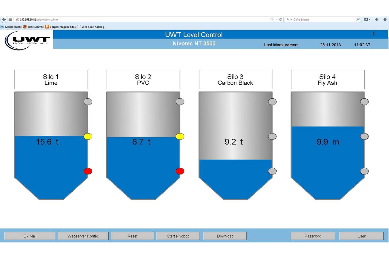 Die elektromechanischen Lotsysteme kommunizieren direkt mit SPS-Steuerungen über ein analoges 4...20 mA-Signal oder auch ein digitales MODBUS RTU- oder Profibus-Protokoll. Damit waren die Lotsysteme direkt kompatibel zu allen gängigen Steuerungssystemen. Durch die große Auswahl an unterschiedlichen Füllstandsregelungen innerhalb der UWT NivoTec® Serie NT 4500 konnte für das Zementwerk eine passende wirtschaftliche Variante gefunden werden. Die Füllstandsignale des installierten NivoBob® auf jedem Silo wurden von der Visualisierungssoftware in Kombination mit einem Wago WebController gebündelt. Die empfangenen Informationen wurden über eine Ethernet-Verbindung über eine geroutete IP-Adresse an das Internet weitergegeben. Die Anlage konnte diese Informationen (passwortgeschützt) über einen beliebigen Internet-Browser zu jeder Tageszeit über eine vordefinierte IP-Adresse sicher abrufen. Es ist möglich, beliebig viele weitere Silos in das Visualisierungssystem einzubinden - ohne zusätzliche Hardware oder Kosten.